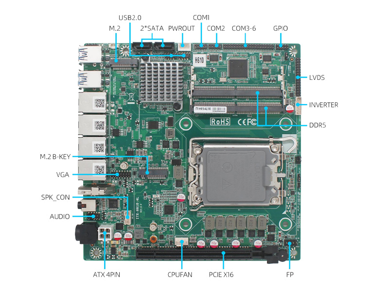 | MINI-ITX工業主板 支持基于 Intel H610 芯片組 支持 12 ~14代 Intel Core i3/i5/i7 LGA1700 支持DDR5×2 雙通道,最大支持 64G 顯示支持:VGA+HDMI+LVDS/EDP 6×COM口 (支持 RS232) 支持4×LAN千兆網口,4×USB 3.0 支持網絡喚醒、上電開機、看門狗等 產品符合CE FCC ROHS規范 |