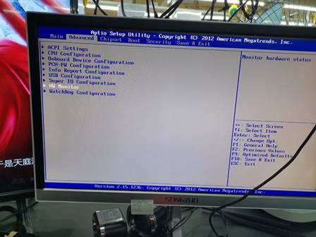 1.開機按住鍵盤DEL鍵 進入BIOS,按左右鍵選擇Advanced,再選擇 HW Monitor選項;